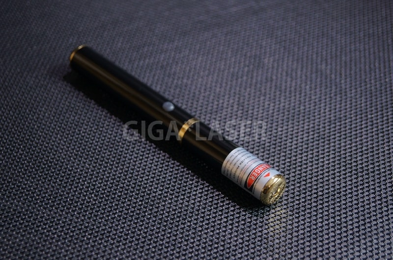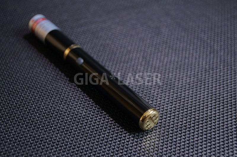レーザーの色味は黄色というより金色に近い美しい色味のレーザーポインター。ゴールドカラーは視認性も良好で明るく見やすいです。5mW版はプレゼンではちょうどよい輝度と視認性がありますが、スイッチボタンの押し具合が少々固めなので、何度も押していると指が痛くなる可能性がありますのでプレゼンには不向きかもしれません。